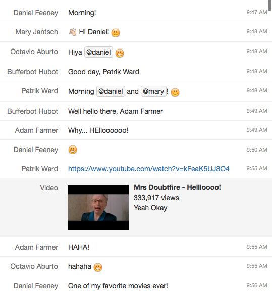 The team at Buffer uses the communication tool HipChat to connect throughout the day on work related tasks, but they also use it to share what’s going on in their lives; sharing funny photos, memes or gifs. They take time out each morning to greet each other with a simple hello.